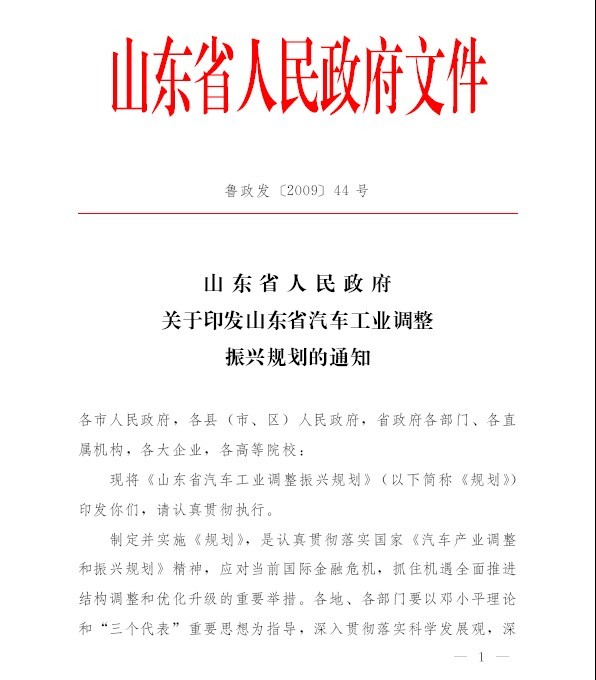 山東省汽車工業調整振興規劃 魯政發[2009]44號